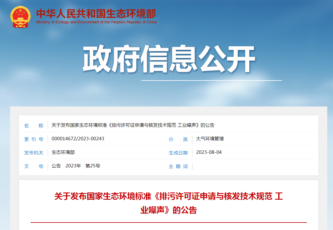 关于发布国家生态环境标准《排污许可证申请与核发技术规范 工业噪声》的公告