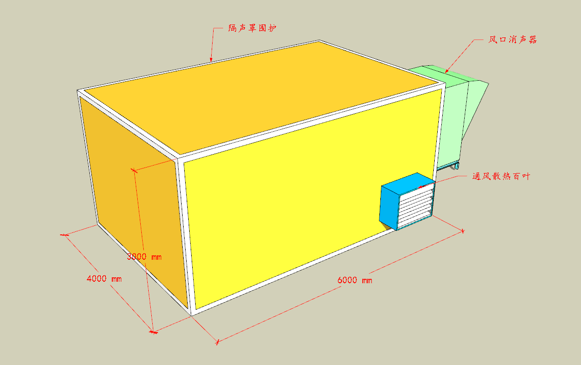 沿油烟机组的侧立面搭建钢结构框架,钢立柱选用100*100方钢。在钢结构上安装吸隔声模块,侧面安装进风消声百叶;吸隔声模块板材选用我公司的SLF-I型吸隔声板,板材设计隔声量达32dB,消声百叶设计消声量达10dB,风口消声器消声量达18dB,整体隔声罩隔声量达22dB。